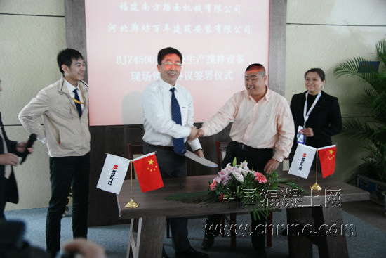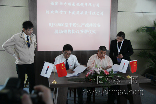 中國混凝土網(wǎng)訊:2010年11月24日下午,南方路機展臺二樓會客廳內(nèi)高朋滿座、掌聲不斷,在這里正在舉行南方路機公司與河北廊坊百年建筑安裝有限公司關(guān)于參展產(chǎn)品BJZ4500型干粉生產(chǎn)攪拌設(shè)備的現(xiàn)場銷售簽約儀式。這是南方路機在本次展會與杭州光華路橋工程有限公司簽單之后的又一訂單,之前,還與北京建筑材料科學(xué)研究總院簽署了戰(zhàn)略合作協(xié)會。此次寶馬展,對于南方路機公司來說可謂喜報頻傳,收獲甚豐。(中國混凝土網(wǎng)記者現(xiàn)場報道)