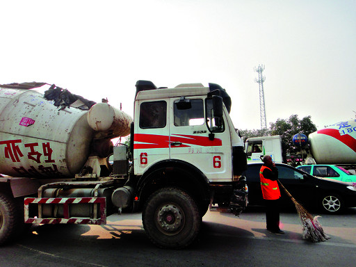 10月18日8時30分許,在淇濱區黃河路與107國道交叉口處出現驚險一幕:3名環衛工人冒險站在馬路上,攔下了5輛商砼車。經了解,原來是商砼車撒漏混凝土,讓環衛工清掃犯了難,無奈之下,環衛工人才冒險攔截商砼車,要求這些司機清理道路上的混凝土。商砼車撒漏不止環衛工冒險攔車“這段道路上,商砼車沿街撒漏混凝土的現象很嚴重。”18日上午,聞訊趕到現場的淇濱區環衛處清掃隊的周副隊長稱,商砼車撒漏的混凝土中摻有水泥,很不好清掃,環衛工人半天都清理不完。出于無奈,負責黃河路與107國道交叉口的3名環衛工見看到出現撒漏的商砼車,冒著危險去攔截。