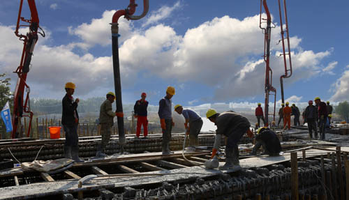 深秋時節寒氣逼人,位于豐南區的津唐運河濱河北大街橋工地上卻是一派熱火朝天的景象。兩臺混凝土高壓泵伸向高高的施工排架,10臺混凝土運輸車往返穿梭,機器的轟鳴聲、混凝土的噴發聲、振搗器的震動聲匯成一部緊張施工的進行曲。從10月20日14:20分,到21日23:00近40個小時連續進行的混凝土澆筑圓滿完成,共澆筑混凝土1400余方。