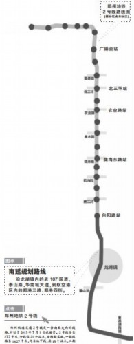 鄭州軌道交通2號線是一條南北走向的線路,計劃于2015年7月1日試運營。2號線全長27.7千米,全線設21個站點,分兩期實施。一期線路長18.27千米,均為地下線,設15個站點,二期線路長9.43千米,設6個站點,均為高架站。