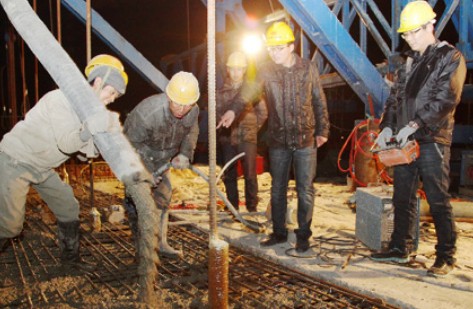 昨日下午,在跨青島南路特大橋施工現場,工人們正忙著綁扎鋼筋,為晚上在合龍段澆筑混凝土做準備。晚7時20分許,隨著指揮人員一聲令下,混凝土通過導管注入大橋主跨中央合龍段。經過2個小時的緊張施工,長2米的合龍段被澆筑上混凝土,這座特大橋連續梁順利合龍。