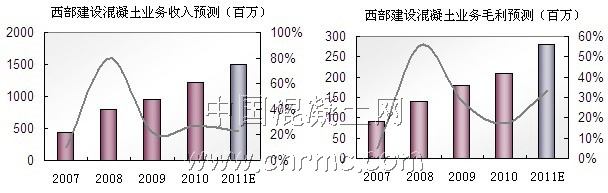 西部建設是全國商品混凝土綜合十強企業之一,是西北地區最大的預拌混凝土生產企業。公司主要產品預拌混凝土的市場是新疆烏魯木齊市、庫爾勒市和奎屯市等三個區域市場,公司在三個區域市場的市場占有率均在40%以上。在2010年年底, 西部建設擬用首次公開發行股票超額募集資金2983.19 萬元為烏市預拌混凝土分公司購置混凝土生產、運輸、泵送設備,以超額募集資金1500萬元為奎屯分公司購置混凝土生產、運輸、泵送設備,以滿足公司長遠發展需要,進一步提高公司商品混凝土在烏昌、奎屯地區的市場占有率及行業地位。預計2011年西部建設的混凝土業務收入增長速率將任然保持在20%左右。按照目前新疆水泥的凈利潤率,預計公司新收購的天宇華鑫水泥開發有限公司將給公司帶來一定的毛利率提升。