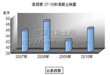 豪西蒙作為一家擁有200年歷史的瑞士企業(yè),其2010年預(yù)拌混凝土的銷售量就已達4590萬m³,下表為本網(wǎng)對公司07-10年混凝土銷量進行的統(tǒng)計。