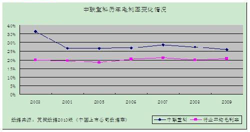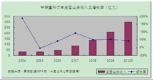 2009年,中聯重科[0.00 0.00%]實現營業收入207.6億元,同比增長53.2%,歸屬母公司凈利潤23.7億元,同比增長51.2%,對應每股收益1.20元。2009年,公司主要產品銷量均大幅增長,其中混凝土機械銷售收入71.57億元,同比增長52.84%,增速高于三一重工[29.10 -2.12%]同類產品,毛利率為28.53%,同比提升0.94個百分點;起重機銷售收入82.98億元,同比增長33.03%,增速高于徐工機械[35.21 -0.59%]同類產品,毛利率為23.66%,同比下降2.6個百分點。其歷年來主營業務收入及凈利潤變化情況,如下列二圖所示: