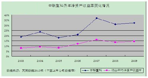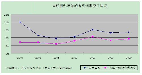在對外投資方面,數據顯示除2006年其對外投資占所有者權益比重略高于之外,其余年份均未超過6%,2009年僅不到2%。年,其銷售利潤率為14%,超出行業平均水平將近5個百分點,如下圖所示: