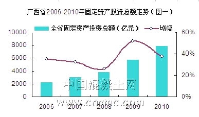 “十一五”時期,廣西省將機遇與挑戰并存,加深區域合作化;調整產業結構和城鎮化進程;加速推進重大工業項目建設,資源和區位優勢進一步得到發揮。廣西省內各地一批新的鐵路、高速公路等基礎建設工程為建筑事業頻添高潮,隨著“十二五”規劃的發布,未來5年的鐵路公路建設規模也初顯雛形。根據以往基礎建設“年底突擊花錢”的特點,2010年12月份基礎建設的投資額將有增無減。這也為廣西省的工程建設奠定了堅實的基礎,混凝土市場也相繼得到更好的發揮。廣西省固定資產投資增長帶動了房產投資額的增加也變向推動了廣西省混凝土行業的發展。 從以上的數據得出一個結論:固定資產的增長影響著房產投資的增長,這樣也在無形中推動著廣西省混凝土產業的增長。