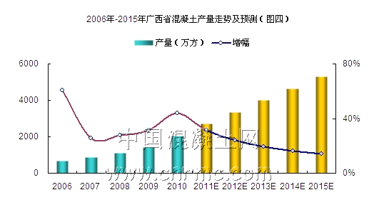| 企業增長的同時,預拌混凝土產量也在飛速增長,據統計,2006年廣西省全省預拌混凝土產能為675.51萬方,截止到2010年產能已過2000萬方,達到了2046.53萬方。年均增長37.86%,產能總量翻了3倍多。(圖四為2006年-2015年廣西省混凝土產量走勢及預測)