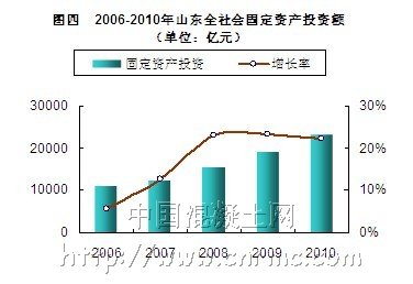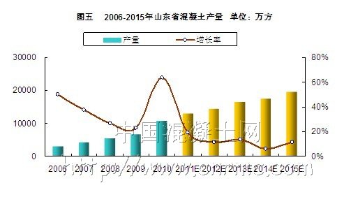 能區劃分的原則,魯南經濟帶在山東省區域經濟發展中的總體功能定位是重點開發區域。如圖四所示,“十一五”期間山東固定資產投資處于一個增長的狀態,由此可以看出山東正進一步推進城市化建設,于此同時也加強交通、能源、水利的建設,積極打造“一群一圈一帶”的模式。截止到2010年山東省地區生產總值達到39416.2億元,“十一五”期間年均增長13.1%,人均地區生產總值突破6000美元。地方財政收入達到2749.3億元,年均增長20.7%。房地產開發投資3251.8億元,比上年增長33.9%。有了這一系列的增長,山東的整個混凝土市場也處于“百花齊放,百家爭鳴”的態勢。如圖五所示,禁現政策的推動下,2010年的山東混凝土市場達到了巔峰,產量一路飆升到10907萬方,在全國混凝土市場占有率達到了9.4%,僅次于江蘇、浙江、廣東之后位列第四,這也充分說明了山東混凝土在全國的市場地位。在“十二五”來臨之際,山東省混凝土行業發展正面臨新形勢、呈現新趨勢,并將進入到一個新的發展階段。