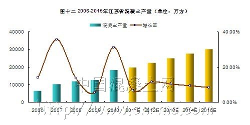 在政府政策導向和強勁的市場需求拉動下,江蘇省預拌混凝土行業已連續幾年保持高位運行,發展勢頭不減。在經受了2009年由于全球性金融危機波及,增速有所減緩以后,2010年,江蘇省預拌混凝土行業實現了歷史新跨越,全行業混凝土供應量達19326萬方,比上年猛增51.79%,增幅創歷史新高。在全國的混凝土市場占有率達到了16.6%,超越浙江山東等地,穩坐中國混凝土市場第一。目前,受經濟復蘇、城市化建設進程加快等大環境的影響,全行業正處在高速發展的快車道上。在“十二五”來臨之際,江蘇省混凝土行業發展正面臨新形勢、呈現新趨勢,并將進入到一個新的發展階段。 (圖十三:2006-2015年江蘇混凝土產量)