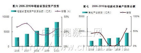 了解完了山東的混凝土市場我們轉向了中國南海邊的福建。近年來,國務院大力支持福建省加快建設海峽西岸經濟區。2010年,福建省加大投資力度,改善基礎設施,力促經濟發展,壯大經濟區的總體實力。如圖六所示,2010年全年福建省固定資產投資8273.42億元,比去年同比增長30.04%,增幅同比上升了10個百分點,投資增速節節攀升,符合宏觀調控預期。累計同比增速較2006-2009年各年同期平均增速28.83%,高了0.12百分點,這說明當前城鎮固定資產投資增速仍處于較高水平。在固定資產增長的態勢下,房地產市場的發展環境有了很大的變化,發展的宏觀環境逐步變好,有效需求不斷增加。福建省2010年房地產投資額為2246.15億元,較2009年上漲58.5%。(投資數據來源于國家統計局和福建省統計局,圖六、圖七涉及福建省2006年-2010年固定資產和房地產投資總額)