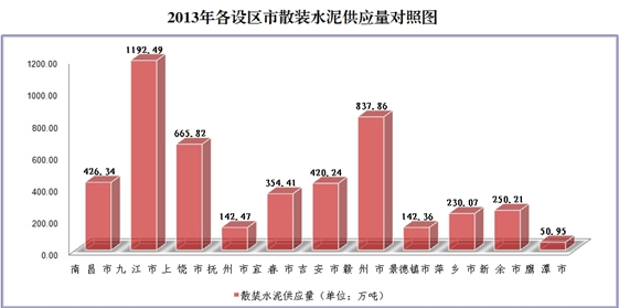 設區市散裝水泥供應量前三位的是九江市、贛州市和上饒市,散裝量分別為:1192.49、837.86和665.82萬噸(見圖二);同比增長量前三位的是吉安市、九江市和南昌市,分別提高160.06、131.49和131.30 萬噸;同比增幅較大的是吉安市、南昌市和鷹潭市,分別達到61.52%、44.5%和41.14%。