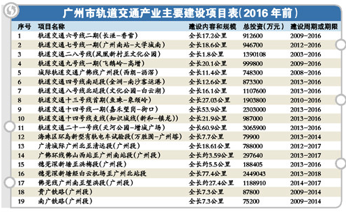 根據《廣州市軌道交通產業主要建設項目表(2016年前)》,2016年前廣州將推動19條軌道交通項目的建設、竣工。19條軌道交通項目總建設里程416.33公里,總投資額超過2039.3億元,其中海珠區環島新型有軌電車試驗段(萬勝圍-廣州塔)、貴廣鐵路(廣州段)、南廣鐵路(廣州段)等3條軌道交通線路將于今年建成。12條軌道交通線路將于2016年建成,包括地鐵六號線二期(長湴-香雪)、七號線一期(廣州南站-大學城南)、二八號線(鳳凰新村至文化公園)、九號線一期(飛鵝嶺-高增)、廣佛線廣州段(西朗-瀝滘)、四號線南延段(金洲-南沙客運港)、八號線北延段(文化公園-白云湖)、十三號線首期(魚珠-象頸嶺)、穗莞深新塘至洪梅段(廣州段)等。廣清城際廣州北至清遠段(廣州段)、廣佛環線佛山西站至廣州南站段(廣州段)、佛莞線廣州南至望洪段(廣州段)等3條軌道交通將于2017年建成。穗莞深新塘經白云機場至廣州北站段將于2018年建成。