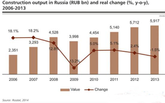 跟據PMR的報告,俄羅斯建筑產出2013年比2012年縮小1.5%,而2012年比前一年增長了2.4%。
