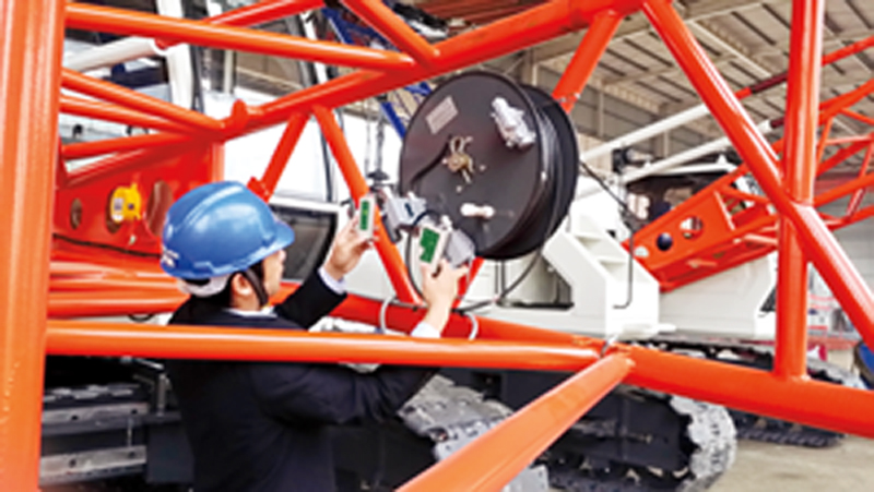 董兵說干就干,在市場上購置了一個網線檢測工具,通過差異比較,發現履帶吊臂架線束線芯比網線多且接頭不一樣,于是他立即制作了轉換接頭將其連在一起。改善完成后,將這個網線檢測工具一分為二接在履帶吊臂架線束的兩端,就能快速檢測出臂架線束是否暢通,精準定位故障點,一次可檢測履帶吊臂架16根線束是否合格,滿足了QUY650T及以下噸位產品的臂架線束檢測要求。一個專用于檢測履帶吊臂架線束的工裝就這樣大功告成了。