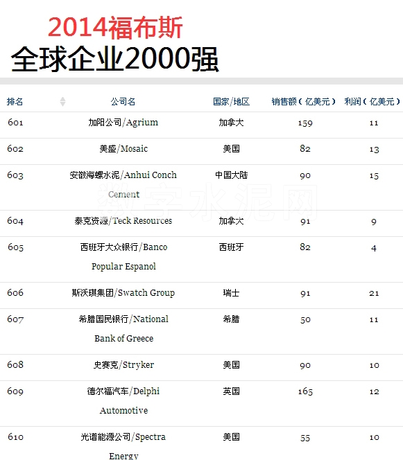 2014年5月8日,《福布斯中文網》發布了2014福布斯全球2000強榜單,其中海螺水泥排名遞進了125位,位列第603位。