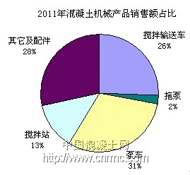 (數(shù)據(jù)來源:中國混凝土網(wǎng)) 2011年工程機(jī)械行業(yè)發(fā)展迅猛,混凝土機(jī)械銷售業(yè)績捷報(bào)頻傳,總銷量為88400余臺,同比增長31.9%,其中,混凝土攪拌輸送車銷量達(dá)68000余臺,同比增長41.7%;我國混凝土機(jī)械2011年銷售收入合計(jì)1053億元,同比增長21.9%,其中,混凝土泵車的銷售收入所占比例最高,達(dá)320.3億元,同比增長24.3%。2011年中,受宏觀經(jīng)濟(jì)的影響,混凝土機(jī)械銷量在8月份出現(xiàn)下滑,但9月份又大幅反彈,整體而言混凝土機(jī)械的市場依然良好。高端的混凝土機(jī)械產(chǎn)品,比如泵車,銷量增速高于混凝土機(jī)械的平均增速,預(yù)計(jì)2012年混凝土機(jī)械銷量將會(huì)保持持續(xù)增長勢頭。隨著我國預(yù)拌混凝土產(chǎn)量的不斷上升,城市化進(jìn)程的不斷推進(jìn),混凝土機(jī)械的應(yīng)用將不斷擴(kuò)大,混凝土機(jī)械需求仍較強(qiáng)勁。