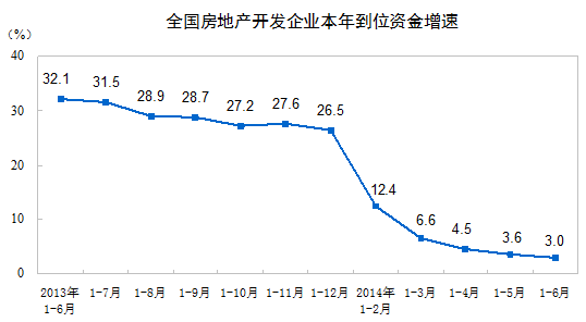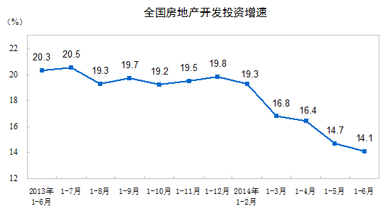 2014年1-6月份,全國房地產(chǎn)開發(fā)投資42019億元,同比名義增長14.1%(扣除價格因素實際增長13.1%),增速比1-5月份回落0.6個百分點。其中,住宅投資28689億元,增長13.7%,增速回落0.9個百分點,占房地產(chǎn)開發(fā)投資的比重為68.3%。