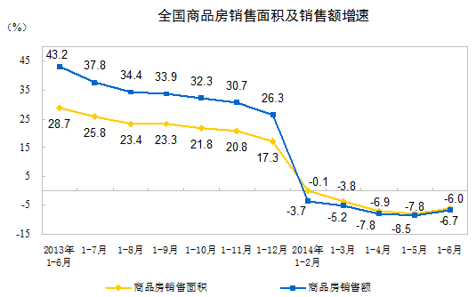 1-6月份,商品房銷售面積48365萬平方米,同比下降6.0%,降幅比1-5月份收窄1.8個百分點。其中,住宅銷售面積下降7.8%,辦公樓銷售面積下降2.8%,商業(yè)營業(yè)用房銷售面積增長7.7%。商品房銷售額31133億元,下降6.7%,降幅比1-5月份收窄1.8個百分點。其中,住宅銷售額下降9.2%,辦公樓銷售額下降12.1%,商業(yè)營業(yè)用房銷售額增長9.8%。