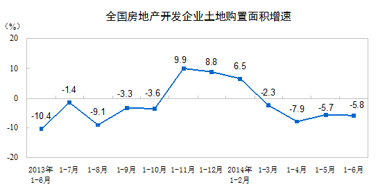 1-6月份,房地產(chǎn)開發(fā)企業(yè)土地購置面積14807萬平方米,同比下降5.8%,降幅比1-5月份擴大0.1個百分點;土地成交價款4031億元,增長9.0%,增速提高0.3個百分點。