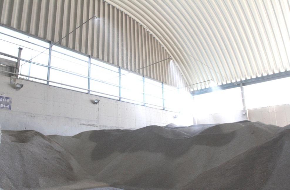 攪拌站的料場(chǎng)占地面積約40畝,針對(duì)積聚在封閉倉(cāng)內(nèi)的粉塵,南方路機(jī)設(shè)計(jì)了骨料噴淋系統(tǒng),通過(guò)水霧噴淋將粉塵降下來(lái)。