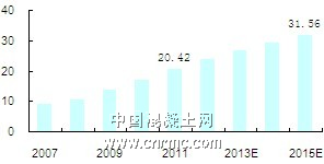 聚羧酸系高效減水劑作為我國第三代新型減水劑,在高速鐵路建設的帶動下,得到了迅猛發展和大量的推廣應用。同時,公路、地鐵等工程對耐久性要求不斷提高,也推動了聚羧酸減水劑的進一步發展。估計未來3-5年內,市場仍將對聚羧酸減水劑保持旺盛的需求。