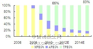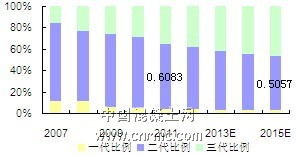 據中國混凝土網統計,2009年萘系等二代減水劑占全部合成減水劑總產量67.5%,2010年占67.1%,2011年占66.5%,雖然所占比例逐年下降,但單純地從減水劑的消費結構來看,二代減水劑消費比例較大。另外,由于萘系減水劑在我國擁有較成熟的銷售市場,與一代、三代減水劑企業相比,規模較大;加上開發使用歷史較長,技術較完善。預計在未來幾年,萘系等二代減水劑仍是市場主流產品。