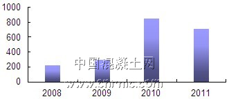 金隅和其他大型水泥企業(yè)一樣都在為延伸下游產(chǎn)業(yè)鏈積極做著努力和嘗試,作為較早進(jìn)去混凝土行業(yè)的水泥企業(yè),金隅可謂是行業(yè)典范,其混凝土公司連續(xù)兩年位居我國(guó)商品混凝土企業(yè)十強(qiáng)排行榜。2011年北京地區(qū)商品混凝土行業(yè)面臨著國(guó)家樓市調(diào)控、產(chǎn)業(yè)結(jié)構(gòu)調(diào)整、環(huán)保力度加大、原材料價(jià)格全面上漲、砂石資源缺口巨大、利潤(rùn)空間日趨狹小等多重壓力,該地區(qū)作為金隅混凝土公司的主要市場(chǎng),同樣也面臨著以上問(wèn)題,2011年金隅混凝土總產(chǎn)量實(shí)現(xiàn)700萬(wàn)方,受以上各種因素的影響,比2010年下降16.9%,位居國(guó)內(nèi)同行業(yè)第五。