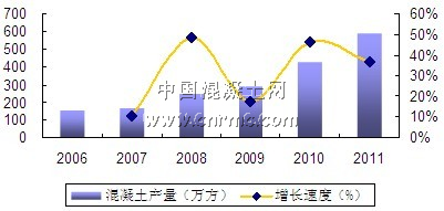 2006—2011年上海城建混凝土產(chǎn)量增長(zhǎng)變化情況  數(shù)據(jù)來(lái)源:中國(guó)混凝土網(wǎng)整理
