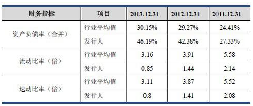 然而面對短期沉重的償債壓力,中國建材依靠自身經(jīng)營償還似乎比較吃力。招股說明書顯示,2011年度至2013年度中國建材的流動比率分別為2.14、1.44、0.85,速動比率分別為2.08、1.41、0.8,兩組指標在報告期內(nèi)均大幅下降。而同期同行業(yè)公司的流動比率均值分別高達5.58、3.91、3.16,速動比率均值分別為5.52、3.87、3.11。由此可見中國建材報告期內(nèi)的流動比率及速動比率指標明顯低于行業(yè)均值,且相距甚遠。說明其短期償債能力明顯偏弱。