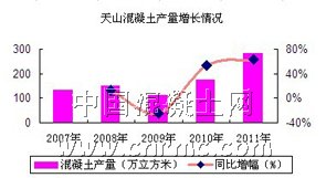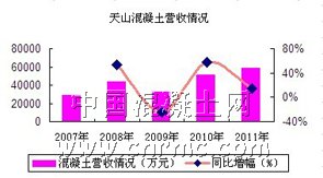 天山水泥股份有限公司地處新疆,商混產(chǎn)業(yè)發(fā)展迅速,所以公司近幾年決定,抓住發(fā)展機(jī)遇,將商混打造成天山水泥的第二產(chǎn)業(yè)。據(jù)統(tǒng)計(jì),天山水泥2007年混凝土銷量為132萬立方米,營收為28518.57萬元;2011年,天山水泥的混凝土銷量已達(dá)283萬立方米,營收也達(dá)到了59041.28萬元,混凝土銷售占比為7.1%。相比于2007年都增長了100%。除此之外,天山水泥在2012年將積極發(fā)展混凝土項(xiàng)目,已將商混的銷量目標(biāo)定為307萬立方米,并且據(jù)最新消息,天山股份擬2.08億元投建四個(gè)混凝土項(xiàng)目,這將標(biāo)志著天山股份在混凝土行業(yè)中將更上一層樓。