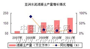 亞洲水泥股份有限公司成立于1957年,作為一家老牌的水泥公司,在提高水泥行業(yè)業(yè)績的同時(shí),也慢慢走出了進(jìn)軍混凝土行業(yè)的第一步。2007年,亞洲水泥的混凝土銷量為72萬立方米,營收為17659萬元;到了2011年,混凝土銷量已達(dá)202萬立方米,營收為67286萬元,占了整體營銷額的8%。同時(shí),為了更快的向下延伸產(chǎn)業(yè)鏈,于2011年成功與中建商品混凝土有限公司達(dá)成合作,共同成立湖北中建亞東混凝土有限公司,為其在混凝土行業(yè)大展拳腳做了鋪墊。
