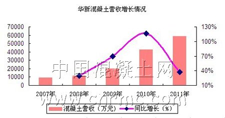 華新水泥自從2002年建成投產(chǎn),2005年建成混凝土分公司,到目前,華新旗下?lián)碛兴膫€(gè)現(xiàn)代化混凝土公司。公司配備有8條180混凝土生產(chǎn)線,220部攪拌運(yùn)輸車,日最大生產(chǎn)供貨能力可達(dá)5萬立方混凝土。在如此規(guī)模下,向混凝土行業(yè)進(jìn)軍已是順勢而為。同時(shí),2008年華新水泥的銷量僅只有58萬立方米,營收為11644萬元,混凝土銷售占比為1.83%;2011年,華新水泥的銷量已達(dá)到500萬立方米,營收為58411.75萬元,混凝土銷售占比為4.62%。憑這優(yōu)異成績,公司一直是湖北省混凝土市場的龍頭。