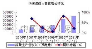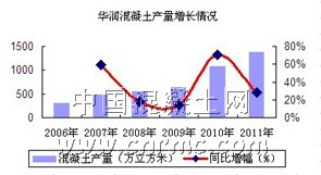 華潤水泥控股有限公司是華潤集團(tuán)旗下主營水泥與混凝土業(yè)務(wù)的公司,其公司的業(yè)務(wù)范圍已粵、桂、閩、瓊、晉、滇、黔、蒙、黑龍江東部、陜北及港澳等十多個(gè)地區(qū)。數(shù)據(jù)顯示,2008年,華潤水泥混凝土銷量為555萬立方米,營業(yè)額為17.13億港元。到了2011年,華潤水泥混凝土銷量為1383萬立方米,營業(yè)額為49.43億港元,相比于2008年分別增長了250%和288%,混凝土銷售占比達(dá)到了17.66%。此外,截止2011年,華潤水泥的攪拌站數(shù)已超過50個(gè),年產(chǎn)能更是達(dá)到3200萬立方米,位居我國混凝土企業(yè)榜首。