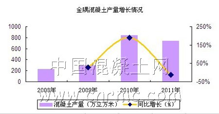 北京金隅股份有限公司旗下有北京金隅混凝土有限公司、天津金隅混凝土有限公司和石家莊金隅旭成混凝土有限公司三家混凝土公司。金隅股份以這三家混凝土公司為基礎(chǔ),逐步擴(kuò)大混凝土業(yè)務(wù),2008年,金隅混凝土的產(chǎn)量為225萬立方米,到了2010年已達(dá)到842萬立方米。2011年雖然只有741萬立方米,但是混凝土營銷收入增長并不影響公司對混凝土行業(yè)的發(fā)展。同時(shí),2011年金隅混凝土營銷收入占了總收入的8%,預(yù)計(jì)到了2012年末混凝土銷售占比或可能超過10%。