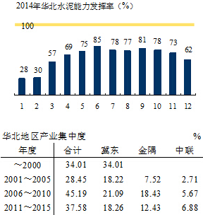 “十五”(2001~2005)期間,新型干法水泥建設(shè)開(kāi)始提速;“十一五”,進(jìn)入高速發(fā)展階段,逐步形成大企業(yè)集團(tuán)格局;“十二五”,華北在產(chǎn)業(yè)結(jié)構(gòu)調(diào)整中,非但沒(méi)有繼接十一五再上一層樓,反而形勢(shì)發(fā)生逆轉(zhuǎn),冀東、金隅兩大龍頭企業(yè)雙雙掉頭。華北近年不斷釋放的產(chǎn)能,在遭遇需求下滑中,供需關(guān)系近幾年不斷惡化,全年水泥能力即使在旺季也不能全部發(fā)揮。集中度下降又增加市場(chǎng)的脆弱。