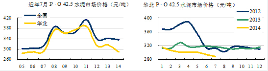 華北水泥價(jià)格在近三年呈下滑之勢(shì),今年1~7月水泥價(jià)格繼續(xù)下調(diào),全國(guó)范圍來(lái)看,華北水泥價(jià)格明顯低于其他地區(qū):