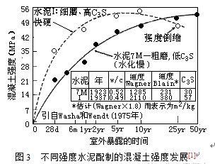 美國的Withy在威斯康辛大學(xué)從1910年開始了50年水泥凈漿、砂漿和混凝土的實驗計劃,澆筑了室內(nèi)和室外混凝土。分別于1910年、1923年和1937年3個不同時間成型了5000多個試件。Washa和Wendt于1975年發(fā)表了這些試件觀測50年的結(jié)果。結(jié)果是:1923年用Blaine細度為5775px2/kg的水泥配制的混凝土28天強度為21MPa,25年強度達到52MPa;1937年用當時的快硬水泥配制的混凝土28天強度為35MPa,5年達到53MPa,10年后強度開始倒縮,25年強度就倒縮至45MPa,比水化慢的混凝土25年強度還低。當時的快硬水泥與當今美國的I型水泥和II型水泥礦物組成與細度相當(C3S為57%,勃氏比表面積為380m2/kg,我國常用水泥也如此)。(見圖3)