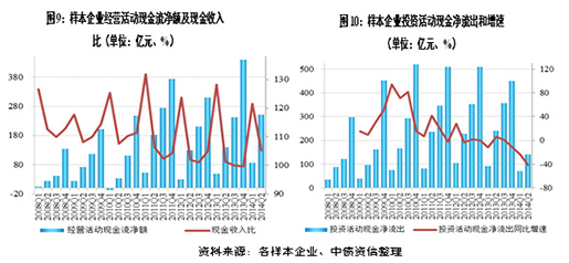 從投資活動現金流來看,如我們在此前的特評中預期,在行業整體產能投放繼續放緩的情況下,樣本企業2014年上半年投資活動現金凈流出141.16億元,同比下降41.49%,在行業整體產能過剩的情況下,行業固定資產投資高峰已過,預計未來短期樣本企業投資活動現金支出規模將繼續放緩。
