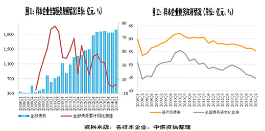 2013年底樣本企業平均資產負債率和全部債務資本比率分別為56.36%和46.20%,2014年上半年收益于盈利能力改善和債務規模增速同比下降,樣本企業財務杠桿繼續出現下降,截至6月末,樣本企業平均資產負債率和全部債務資本化比率將至55.43%和44.76%。