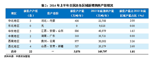 截至2013年底,全國新型干法水泥生產線共1,714條,設計熟料產能約為17億噸/年。2014年上半年全國新投放熟料產線共計22條,合計新增熟料產能約3,106萬噸/年,較年初增加1.82%,但考慮到2013年下半年的產能增長,2014年6月末全國熟料年產能較2013年同期實際增長約0.9億噸,增速達到5.5%,與上半年熟料產量增速5.8%基本持平。分區域來看,東北地區無新增產能;華北和中南分別投產3條和2條熟料產線,西南和華東地區新增產能規模較大。