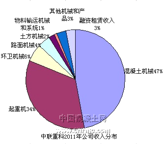 2012年一季度,中聯重科實現總營業收入116.09億元,同比增長8.14%,實現歸屬于母公司股東的凈利潤20.89億元,同比增長3.22%,利潤總額為24.92億元,同比增長5.01%。2011年公司混凝土機械收入占比為47%,毛利占比為51%。今年一季度公司綜合毛利率為32.09%,同比增長0.57個百分;同時在商混率提升和需求下沉的帶動下,毛利率較高的混凝土機械將仍然保持較快的增長,混凝土機械同比增長超過40%,市場占有率提升較大。同時,受益于鐵路、保障房建設與商品混凝土普及率上升等因素,混凝土機械的市場份額將得到進一步的提升。