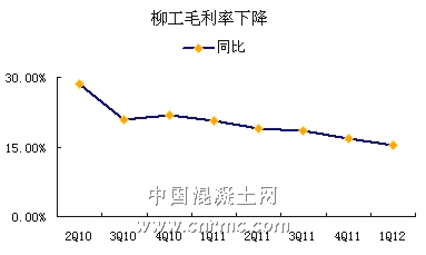 柳工2012年第一季度實現營業收入34.3億元,同比下降42.3%,歸屬母公司凈利潤1.48億元,同比下降75.8%。其業績下降的主要原因還是由于基建工程的停工、房地產調控等因素導致行業步入下滑道,使得公司一季度銷售狀況處于低迷狀態。從2010年第二季度開始至今,柳工集團的營業收入下降幅度逐步擴大,同時毛利率也在逐年下降,兩者均處于低位水平。混凝土機械在公司產品所占份額比重較小,無法扭轉其他工程機械利潤下降給企業所帶來的沖擊。
