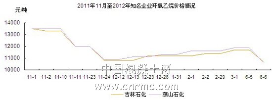 2012年6月6日,環氧乙烷終于難以支撐自3月1日起執行每噸11800元的掛牌價格,國內幾家代表性的企業EO價格紛紛暴跌,撫順、遼陽、吉林等企業都自降1000元/噸的身價,將價格固定在10700元/噸至10800元/噸。而其他中石化企業在6月5日那天實際的銷售價格就已經定格在了10600元/噸。