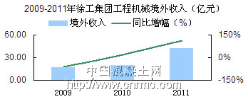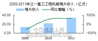 中聯重科是中國工程機械的領軍企業, 2011年中聯重科實現全年銷售收入463.23億元,同比增長43.89%,營業利潤95.14億元,同比增長77.05%。2012年一季度銷售收入116.1億元,同比增長8.14%,營業利潤25.41億元,同比增長9.01%,混凝土機械作為中聯重科最重要的一塊業務,近兩年繼續延續其強勁的走勢,2012一季度混凝土機械營業收入同比增長超過40%。中聯重科在2011年年報中指出,公司將加速全球市場網絡的擴張,重點開發以非洲、亞洲和南美洲為代表的新興市場,并加快巴西、印度的海外制造基地建設,以及推進歐洲和北美研發基地的建設。2011年中聯工程機械境外收入為22.38億元,占工程機械總收入的4.87%。從總的占比來看,目前中聯的出口比重較少,而公司為了進一步擴大海外銷售,近兩年也是推出了一系列的舉措。2008年收購了意大利CIFA公司,另外還在海外新增十幾處分支機構并與幾十家海外代理商合作,進一步完善國際化營銷服務網絡。特別要提到的是通過收購了意大利CIFA公司,中聯重科不但將行業尖端技術拿到了手,并利用CIFA的采購平臺,實現全球資源的共享與整合,這也為中聯開拓海外市場奠定了資本。中聯規劃2015年出口占比達到30%,即出口額要從目前的20億增加至200億以上。