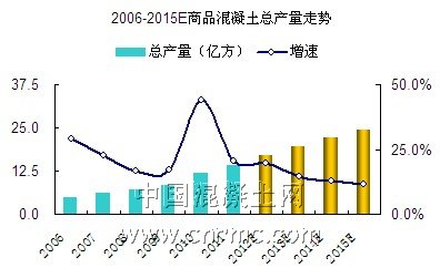 根據(jù)砼網(wǎng)統(tǒng)計(jì),從2006年開(kāi)始,我國(guó)商品混凝土總產(chǎn)量呈上升趨勢(shì),“十二五”期間總量達(dá)到97.2億方,因大部分地區(qū)建設(shè)呈飽和狀態(tài),增速逐漸有所放緩。