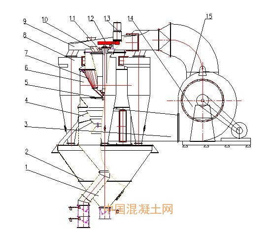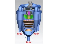 出磨物料由上部進料口喂入,落到與轉子成一體的撒料盤上,轉子隨主軸轉動時,撒料盤上的物料在離心力的作用下沿徑向甩出而分散于選粉室內與旋轉上升的氣流相遇,在選粉室內,分級圈下面附近的氣流及分散于氣流中的物料在分級圈的帶動下與分級圈一起作高速旋轉,而使氣流中的物料受較強的離心力,該力的大小可以通過調節主軸的轉速來調節。當轉速增大時,該力也增大。此時如果保持處理風量一定,則此時的切割粒徑減小,產品變細,如轉速降低則產品變粗。物料中的粗顆粒,質量較大,受撒料盤和分級圈作用,落到滴流裝置時,再次受上升氣流的分選,落到內錐,從粗粉管排出,通過分級圈的細粉經旋風筒收集落入集灰斗,經細粉管排出,清除細粉后的空氣則從旋風筒中心經風管返回節能減震風機形成氣流閉路循環。