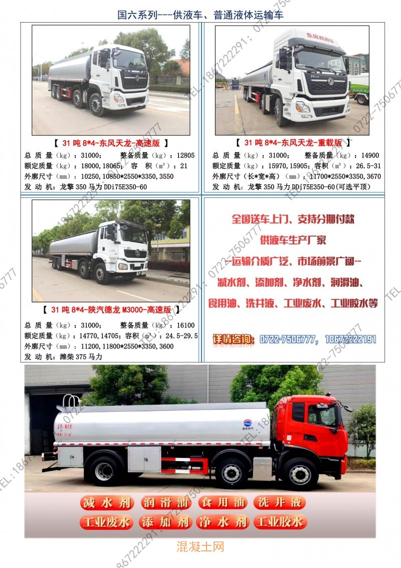 該車型運輸介質廣泛、市場前景廣闊。主要運輸介質:混凝土減水劑、添加劑、凈水劑、潤滑油、食用油、洗井液、工業廢水、工業膠水、熱水溫泉等非危險品液態介質。