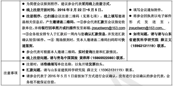 7.請入住溫德姆酒店和海都酒店的參會代表,于2016年4月25日前,告知山東建科院 薛立文 參會的交通方式到達時間,以便提前安排接機車輛。