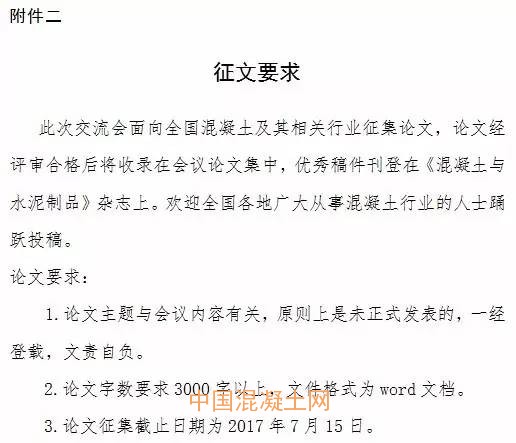 圍繞本次會議主題,公開征集論文,歡迎全國從事混凝土及外加劑研究、生產、設計、質檢和施工的專家、學者、技術人員及相關人員投稿、參會。會議論文發至《混凝土與水泥制品》雜志社會議論文專用郵箱[email protected](要求見附件二)。優秀會議論文將推薦至《混凝土與水泥制品》雜志刊發。