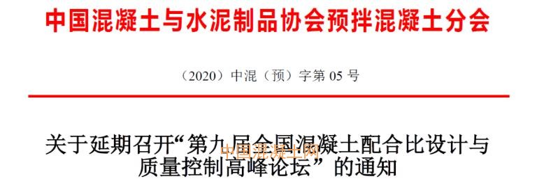鑒于目前新型冠狀肺炎病毒疫情情況,為配合做好新型冠狀病毒疫情防控工作,經研究,原定于2020年4月15日-17日在湖北武漢召開的“第九屆混凝土配合比設計與質量控制高峰論壇”將延期舉行。有關具體會議調整和安排將另發文通知。